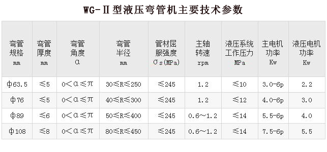 WG-Ⅱ型彎管機(jī)是我公司自行研制的具有彎制不大于180度的各種角度管件的專用彎管設(shè)備。本機(jī)為冷彎式液壓彎管機(jī),不用芯棒與加熱灌沙等工藝,適用于在冷態(tài)條件下彎曲輸送流體用無(wú)縫管和一般用途鋼管,可廣泛使用于鍋爐、化工、石油、暖通、金屬結(jié)構(gòu)及機(jī)械制造行業(yè)等領(lǐng)域。